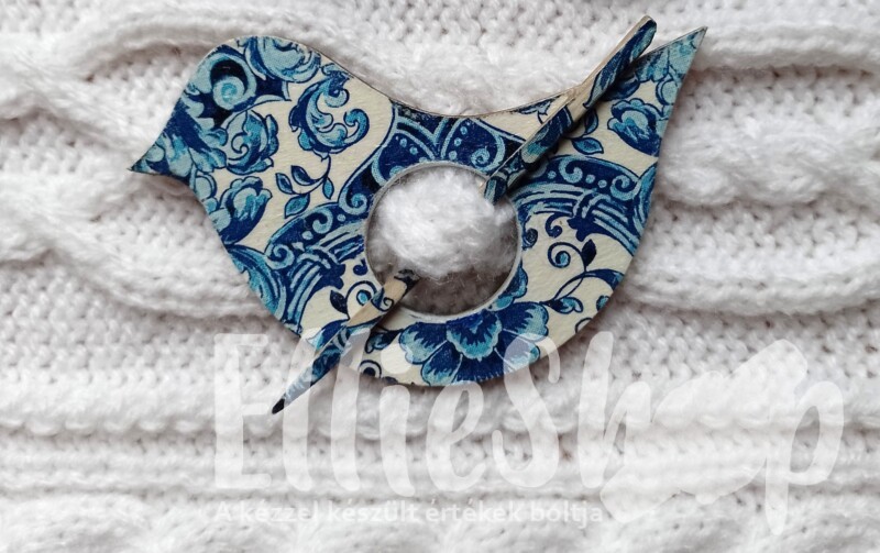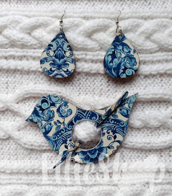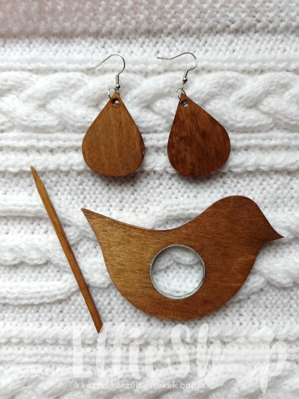Kismadár alakú, dekupázsolt, fa sáltű+fülbevaló szett
