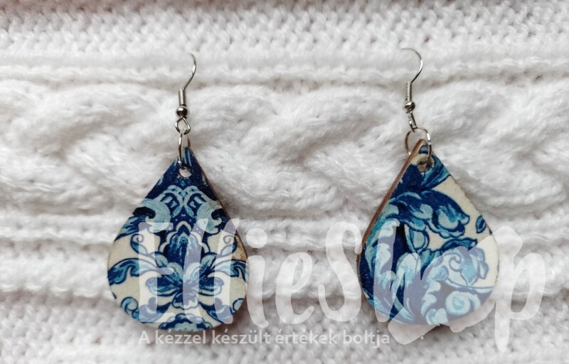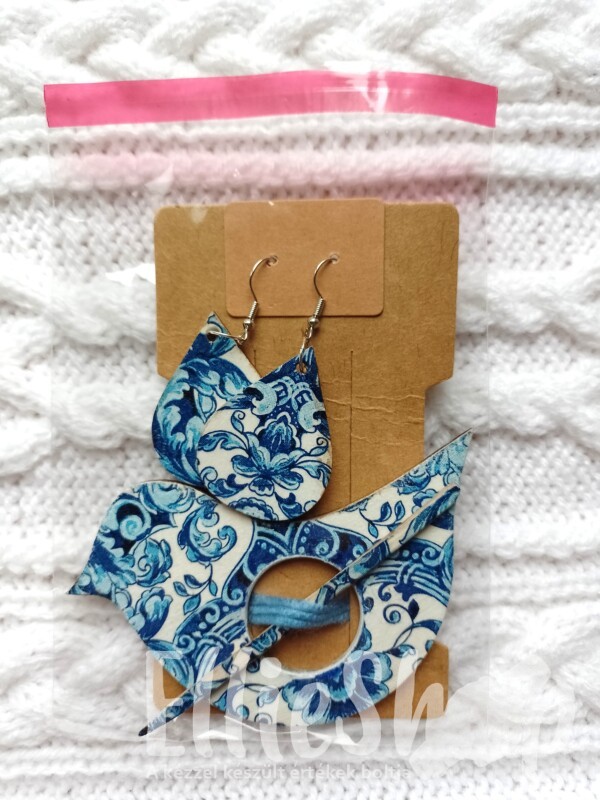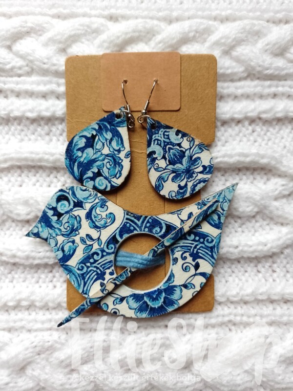 Elegáns, kék–fehér mintás sáltű és fülbevaló szett, amely harmonikus megjelenést kölcsönöz bármely öltözéknek. A csepp formájú fülbevalók és az egyedi kialakítású sáltű tökéletesen illenek egymáshoz, finom, mégis karakteres kiegészítőt alkotva. Ideális választás mindennapi viselethez vagy különleges alkalmakra.