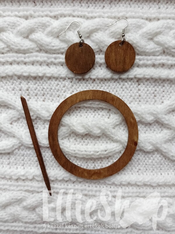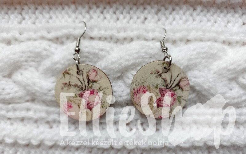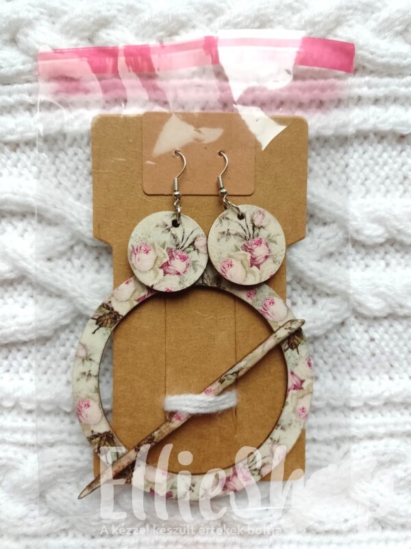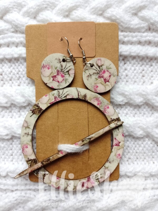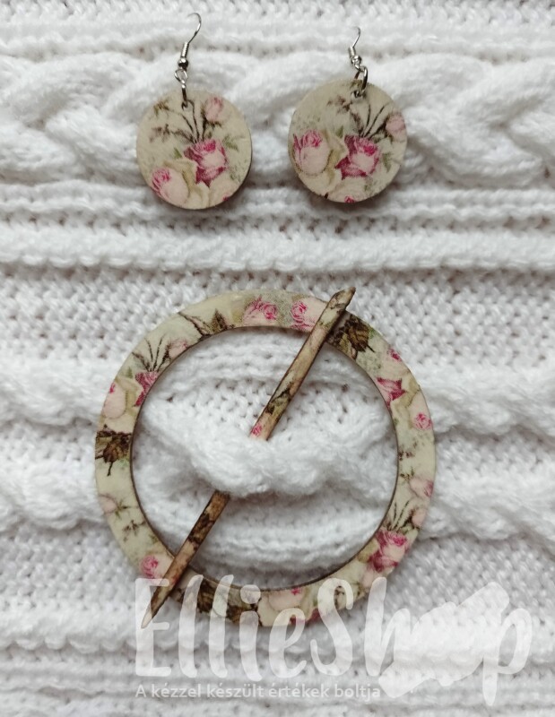 Dekupázsolt, kerek, rózsamintás fa sáltű+fülbevaló szett